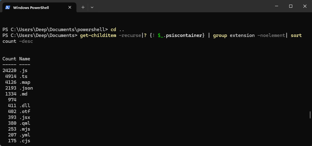 We can also use the command for some important tasks. Lets say you need to get the count of file extensions and sort by count.