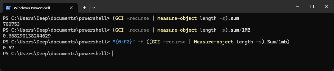 The above code should give you the size of the folder in bytes, however if you want to show the size in MB, or GB, you can add divide the result by 1MB, or 1GB, respectively. To format this even more, you can have Powershell display the output with 2 decimal places: